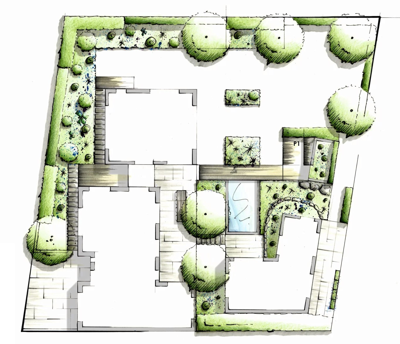 Ein detaillierter Plan, wie er hier beispielhaft zu sehen ist, ist Basis für die Gestaltung jedes Gartens. Anhand dieser Entwurfsplanung werden die einzelnen Elemente und Veränderungen im Garten durchbesprochen.
