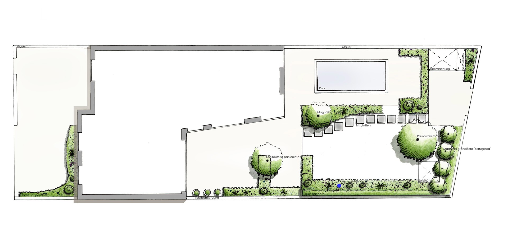 Mehrgenerationengarten mit klarer Abgrenzung der Poolzone. Unterschiedliche Bedürfnisse sollten berücksichtigt werden. Persönliche Lieblingspflanzen, insbesondere die Araucaria, waren einzubinden.